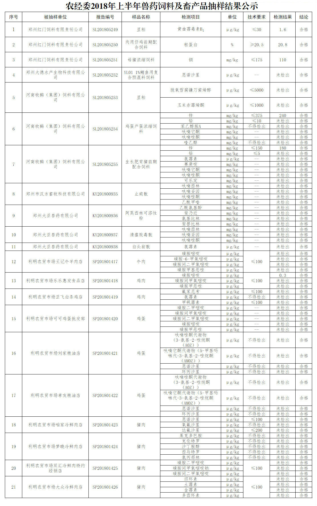 农经委2018年上半年兽药饲料及畜产品抽样结果公示